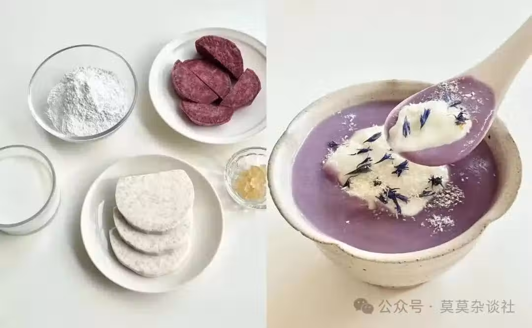 芋頭、紫薯蒸熟後,加牛奶和糖,用破壁機攪拌成細膩的芋泥。