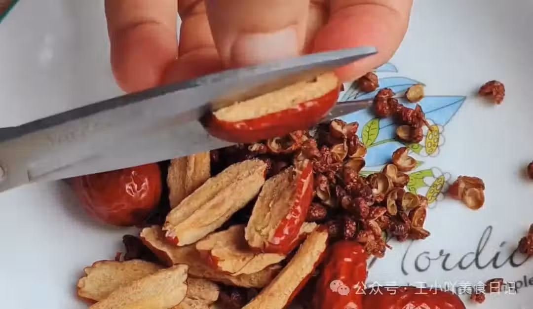 處理紅棗:接下來,用剪刀將紅棗剪開,去除棗核,保留棗肉。紅棗富含營養,口感香甜,是補氣血的佳品。處理好的紅棗放一旁備用。
