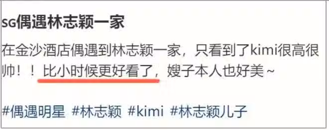 這次林志穎一行人被偶遇,偶遇者也表示kimi本人很高很帥,比小時候更好看了。但平心而論,kimi只有眼睛和爸爸林志穎很像,下半張臉有自己的風格。