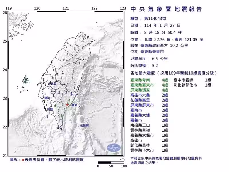 ▲初五下午2時2分,台東規模4.1地震與小年夜(1/27)早上台東地震的位置相同。