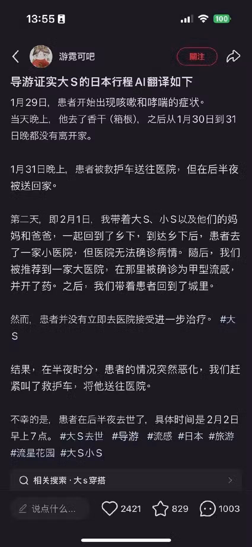有網友分析指出,大S在確診A流後,團隊僅在小醫院就診後便返回東京,未進一步尋求大醫院治療。