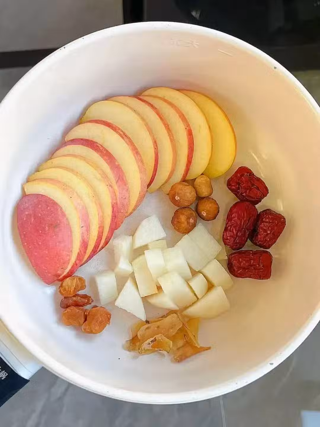 【做法】:準備好雪梨半個洗乾淨去皮,切成小塊,蘋果半個洗乾淨去核切成小塊,放入鍋中,加入桂圓5顆,去核紅棗5顆,百合6片,無花果4顆,這些食材清洗乾淨後放入鍋中,倒入600毫升的清水大火煮沸,轉小火煮20分鐘,最後可以適當加些阿膠粉或冰糖即可飲用。