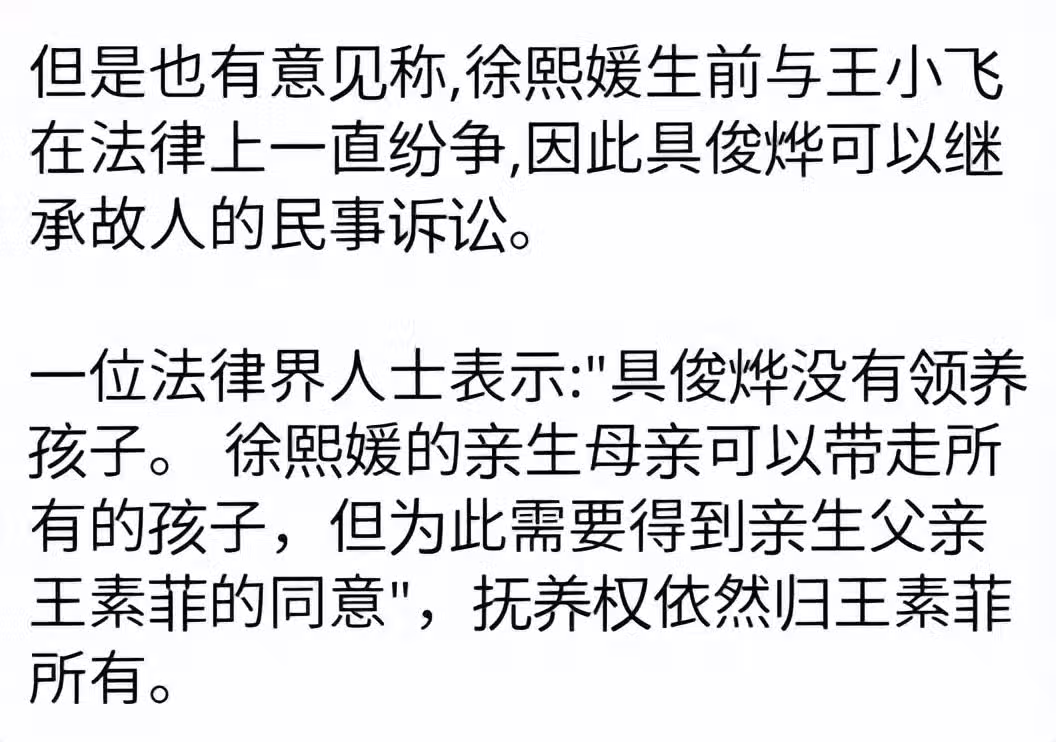 一名法律人士表示,具俊曄沒有領養小孩,大S媽媽可以帶走孩子,前提是得到汪小菲同意,孩子的撫養權歸汪小菲所有,而汪小菲與大S還有兩件官司在打,具俊曄可以繼承大S的民事訴訟權。