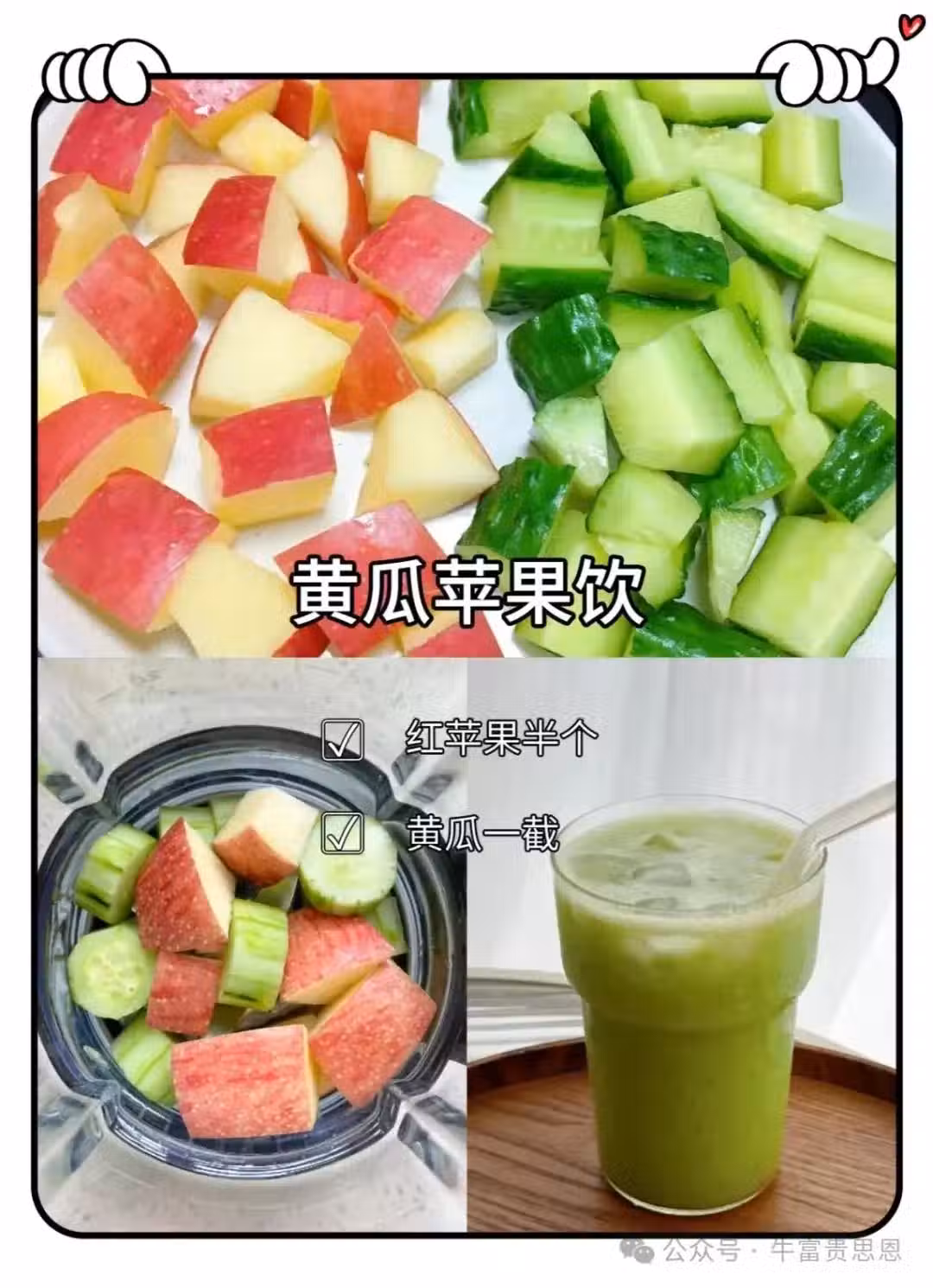 「黃瓜蘋果飲」是一款清新健康的果蔬飲品。紅蘋果的香甜與黃瓜的清爽相互融合,口感豐富。蘋果富含多種維生素和膳食纖維,黃瓜則含有豐富的水分和維生素,二者搭配榨成的飲品,營養豐富,色澤誘人,是日常補充營養和水分的佳品。