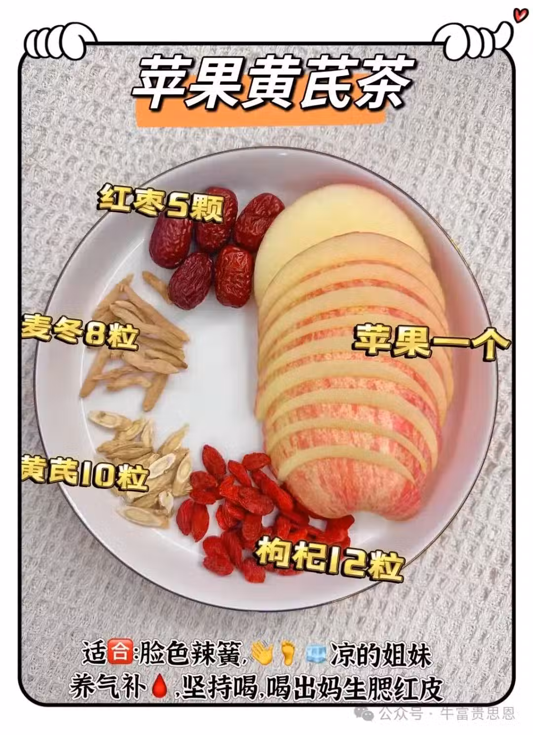 紅棗5顆、麥冬8粒、黃芪10粒、枸杞12粒、蘋果1個