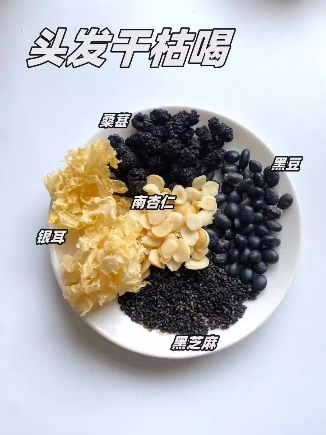黑豆、黑芝麻和桑葚都具有滋補肝腎的功效,能夠改善因肝腎不足導致的頭髮乾枯問題。南杏仁和銀耳都具有潤肺止咳的功效,能夠改善因肺燥導致的頭髮乾枯和脫髮問題。可以滋養肌膚和頭髮,使頭髮變得柔順光滑,同時也有助於改善膚色和膚質。