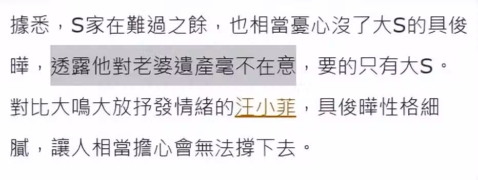 另外,針對外界好奇的遺產分配問題,台媒爆料具俊曄跟家人表態「對老婆遺產毫不在意,要的只有大S」。換而言之,已經放棄繼承大S遺產,身邊朋友都知道具俊曄比較柔軟脆弱,擔心沒了大S的具俊曄會想不開,也特別關心具俊曄。