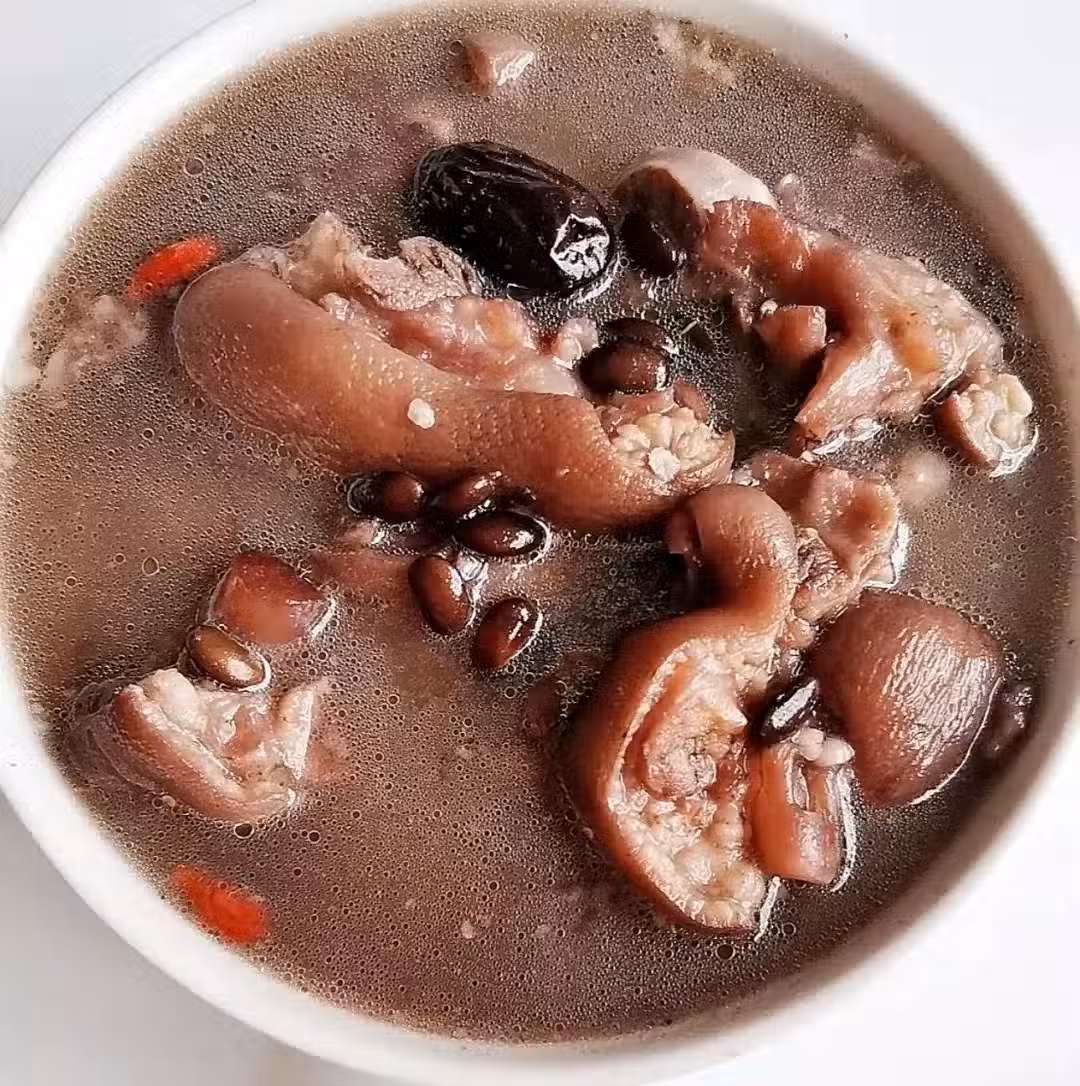 豬腳600克、黑豆100克、紅棗6顆、枸杞一小抓、姜兩片