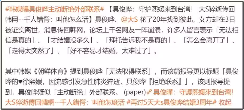 也有網友吐槽,大S跟具俊曄結婚,兩地婚姻維繫需要用心,大S去年還跑去了韓國,今年過年還被曝先去了韓國,然後去日本跟家人匯合。結果不知道是不是太折騰了,身體扛不住,惹上了流感。