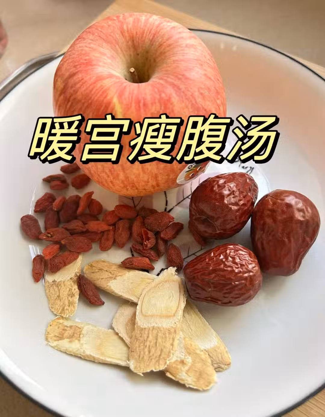 1.準備材料:新鮮蘋果1個,紅棗3顆,黃芪6片,以及適量的枸杞備用。