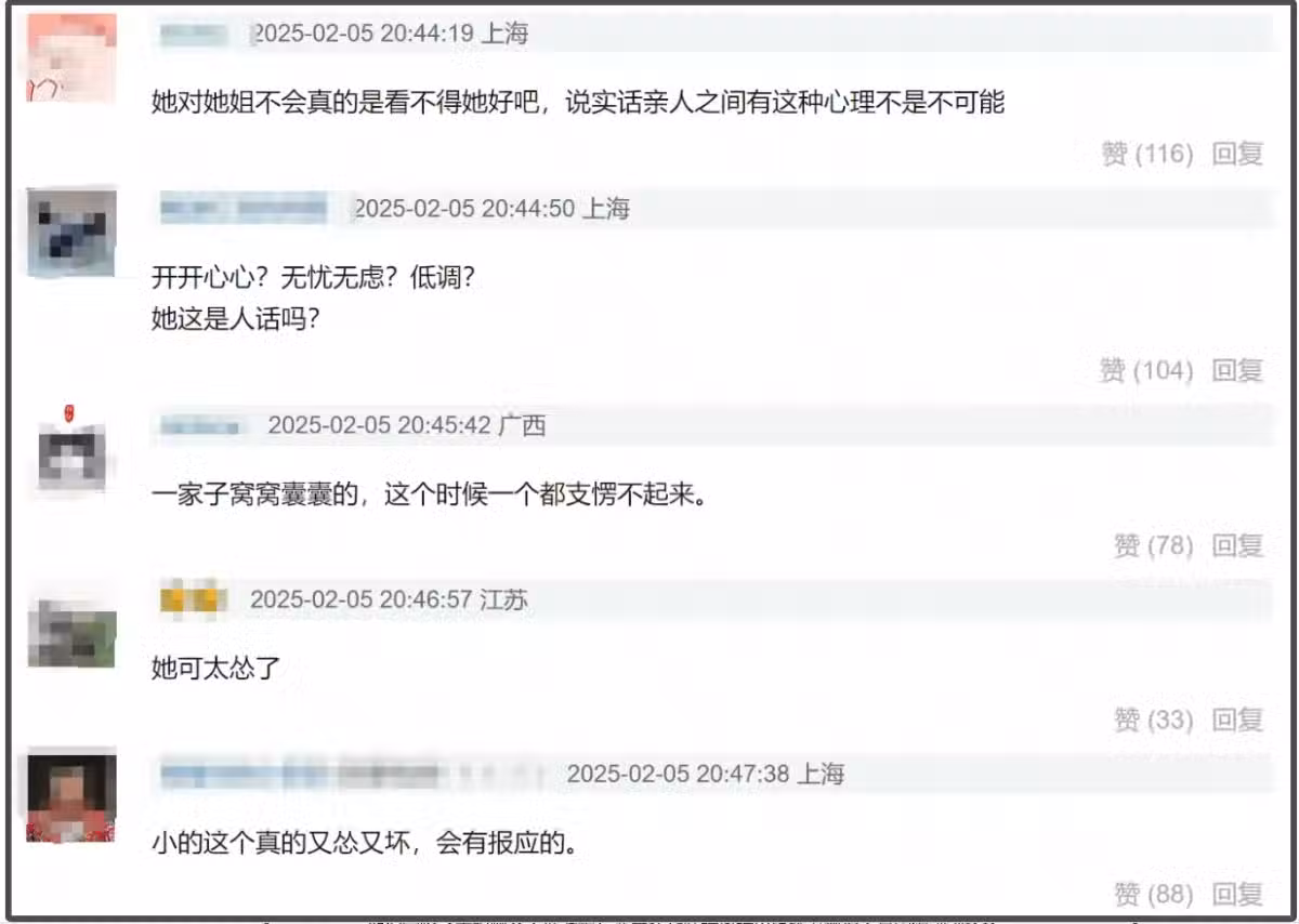 還有網友對於徐家人的做法感到迷惑和不解,覺得他們從頭到尾都太過依賴大S,現在她不在了,一家子完全無法支棱起來,尤其是小S,以前總是躲在大S身後,這個時候最需要她,卻不敢面對,不辦告別不下葬,發聲總是通過經紀人或者親友,質疑她難道要躲著一輩子不見人。