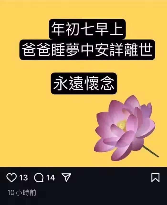 俞明的女兒在社交平台發文稱:「年初七早上,爸爸睡夢中安詳離世,永遠懷念」。