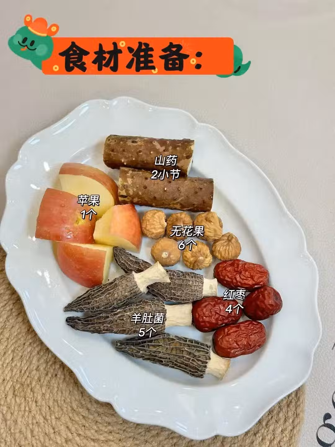 食材處理:羊肚菌用溫水泡發,泡發後洗凈泥沙;蘋果去皮去核,切成小塊;淮山去皮切塊,放入清水中防止氧化;無花果、紅棗洗凈,紅棗去核;豬骨洗凈,切成適當大小的塊。