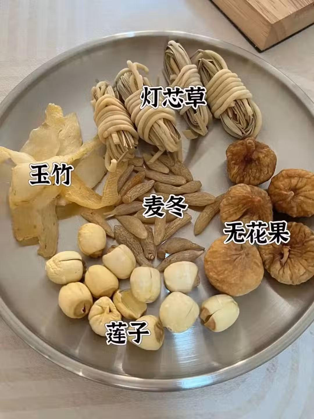 ⑤石斛麥冬降火水:經常熬夜,皮膚暗黃長斑,失眠心煩,喝酒抽煙口氣重的朋友,一定要多喝這款石斛麥冬降火水,可以滋陰養肝,清熱潤肺,特別是喉嚨發炎,牙疼口臭,口腔潰瘍,肝火旺盛的朋友要多喝哦~ 【做法】:蘋果準備好麥冬8g,西洋參6g,石斛8g,去核紅棗5顆,無花果4顆,蜜棗2顆,把這些食材洗乾淨倒入鍋中,加入適量的清水大火煮開,轉小火煮30分鐘即可。