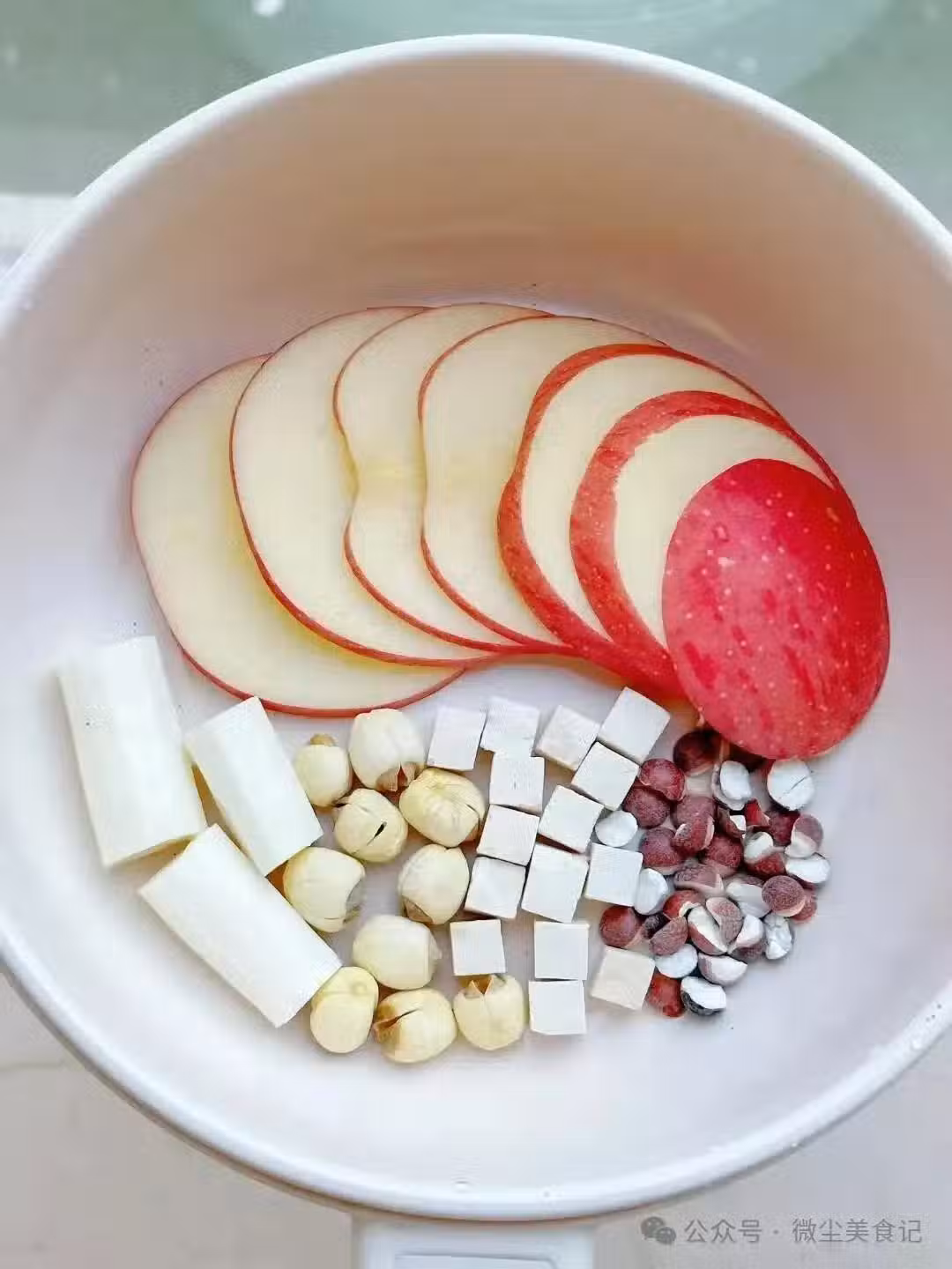 食材:蘋果一個、山藥20克、茯苓10克、蓮子10克、芡實10克