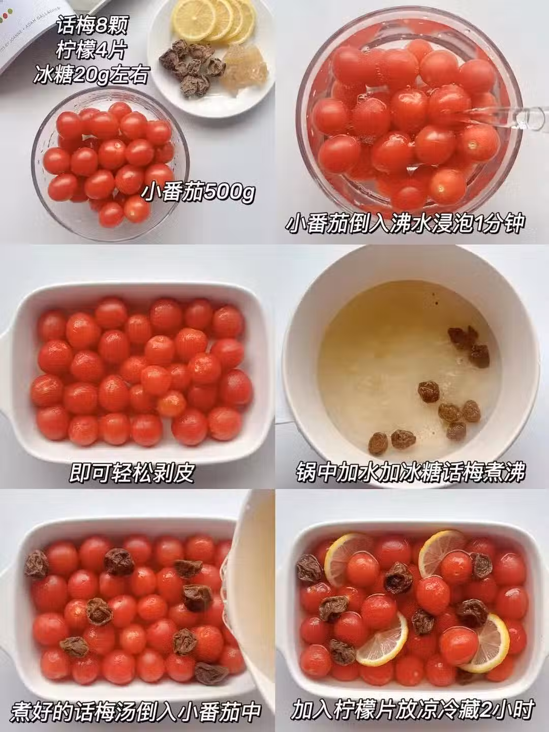 2.洗一個乾淨的鍋,把話梅和冰糖放進去,加入適量清水,大火煮開後,再把去皮後的小番茄倒進去,放入檸檬片,放冰箱冷藏2小時即可