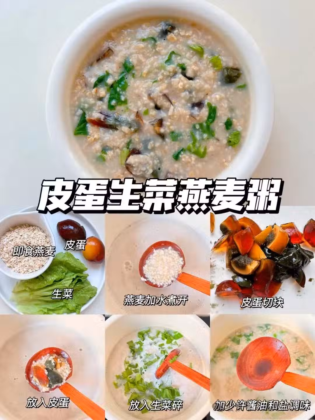 食材:燕麥片40g | 皮蛋2個 | 生菜50g | 鹽適量