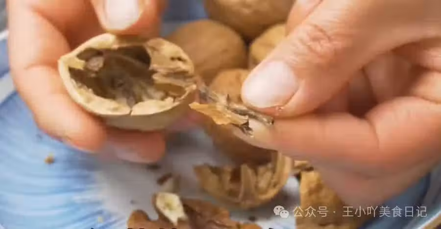 將核桃剝去外皮,取出分心木和核桃仁。分心木用清水清洗乾淨,控水撈出備用。