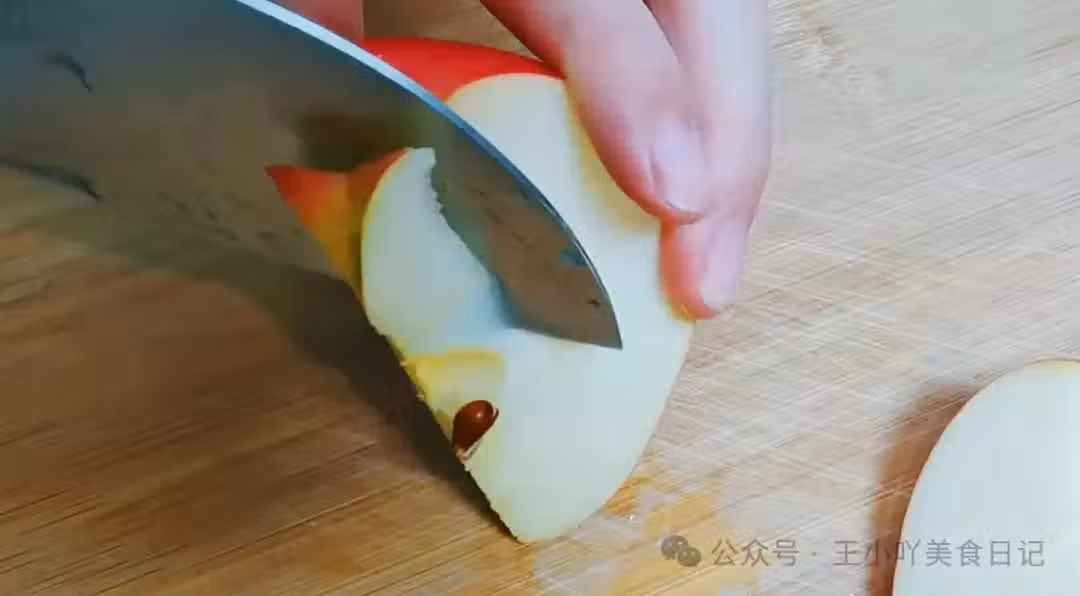 3、處理蘋果:將清洗乾淨的蘋果一分為四,去除中心的蘋果核。蘋果核內含有氫氰酸,這是一種對人體有害的物質,因此必須去除。接著,將蘋果塊對半切開,再切成薄片,便於煮制時營養成分的釋放。