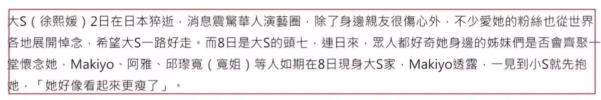 姐姐的死對於小S打擊很大,可以說是處在崩潰的邊緣,但看到眾多好友的到來,小S還是堅強地招呼大家一起吃水果、喝香檳、聊姐姐。