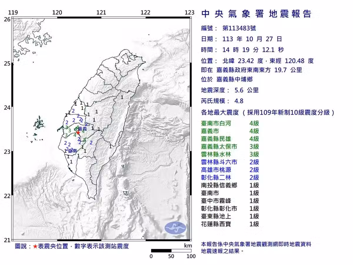 14:19 嘉義發生規模4.8地震 10縣市有感