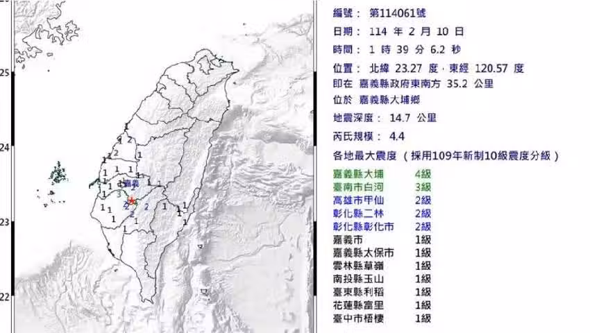 又震了!嘉義大埔凌晨「規模4.4地震」10縣市有感