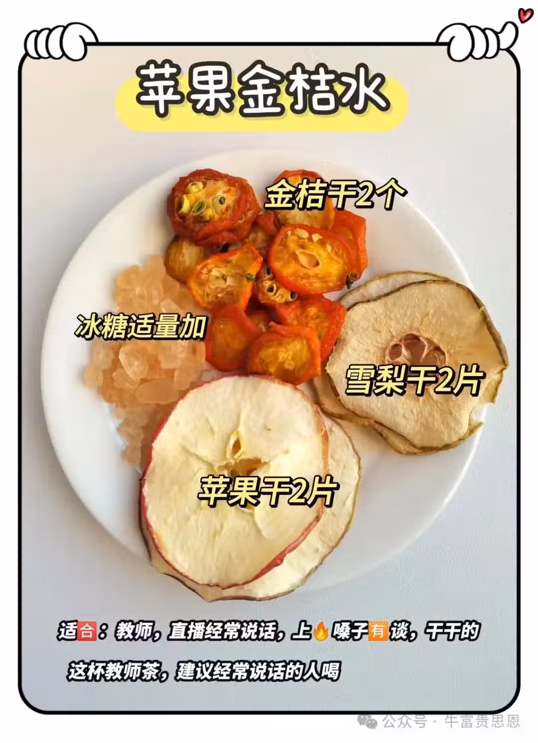 「蘋果金桔水」是一款適合經常用嗓人群的養生茶飲。金桔的酸甜、蘋果乾的清甜與雪梨乾的清爽相互融合,再加上冰糖的調味,口感酸甜可口。此飲品對於教師、主播等經常說話導致嗓子有痰、乾澀的人群有一定的潤喉作用。
