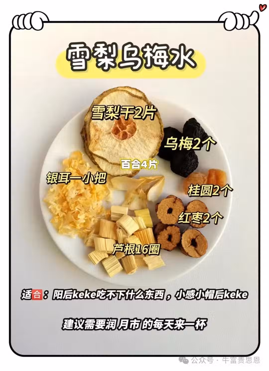 「雪梨烏梅水」是一款適合在輕微感冒咳嗽時飲用的潤肺養生飲品。雪梨乾清甜,烏梅酸甜,搭配上銀耳的軟糯、百合的清香、桂圓和紅棗的甜潤以及蘆根的甘淡,能起到較好的潤肺作用,幫助緩解咳嗽不適。