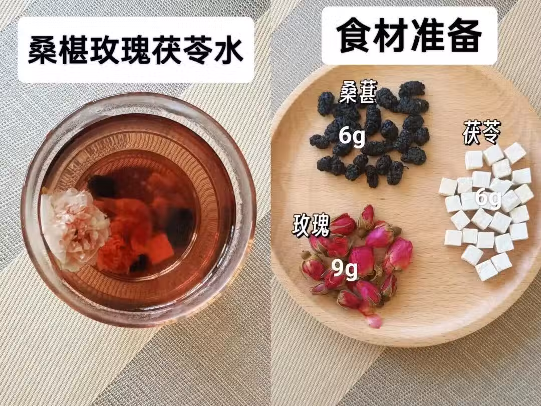 做法:先將茯苓放入養生壺中加水煮20分鐘,再加入玫瑰花和桑葚煮5-10分鐘即可。