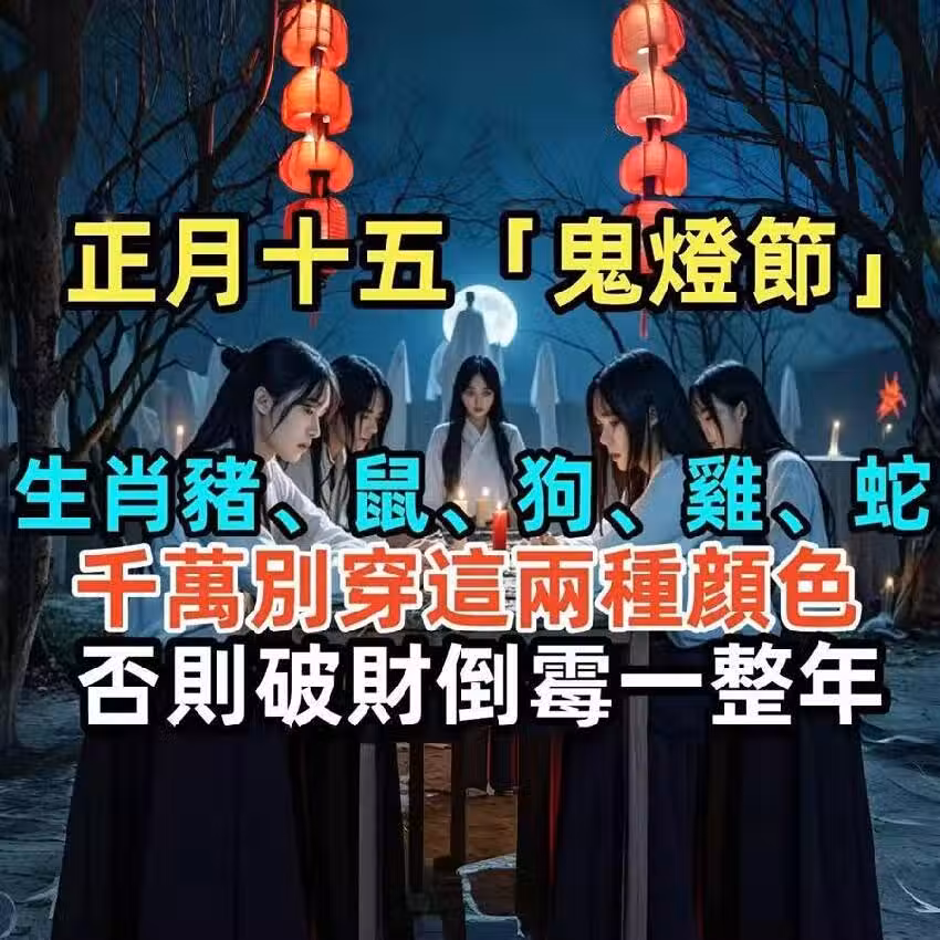 正月十五元宵節,也被稱為「鬼燈節」,是傳統民俗中陰陽交替、運勢變動的重要時刻。 這一天不僅是賞花燈、吃湯圓的節日,更是影響全年財運和運勢的關鍵時刻。 特別是生肖豬、鼠、狗、雞、蛇的朋友,在「鬼燈節」當天絕對不能穿這兩種顏色,否則可能破財、招霉運,甚至影響整年的運勢!