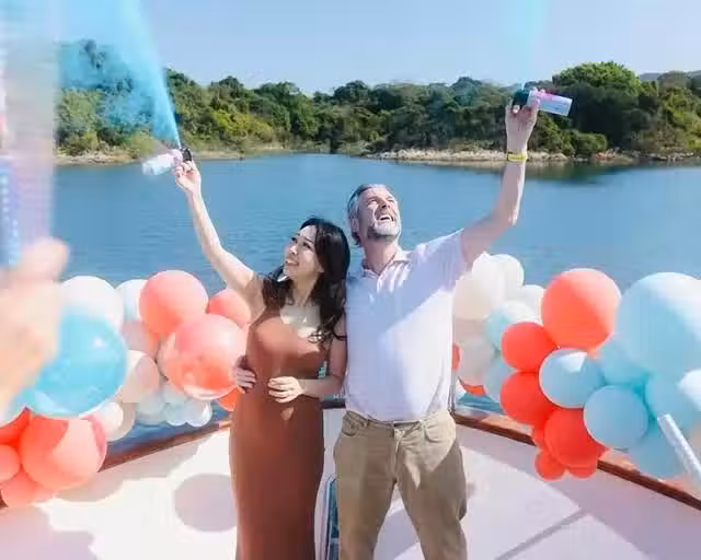 不過有趣的是,正當林煒珽公布肚中寶寶性別,用早就準備好的氣壓槍,打出藍色彩帶的時候,海上突然就颳風了,將噴射出來藍色的彩帶颳得滿天飛舞。