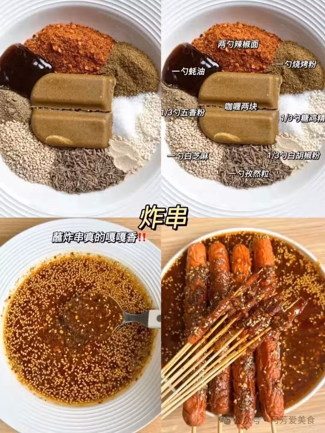 炸串,這款非常適合在家庭聚餐燒烤的時候用。調製好各種的料後,一定要加入咖喱醬,非常的香!味道直接激發出來了,在抹在串上面,香的很。