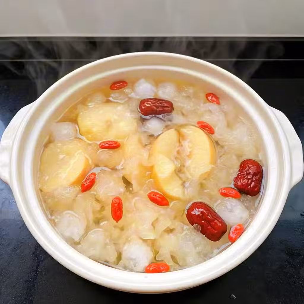 做法:銀耳提前泡發,撕成小朵。蘋果洗凈,去核,切塊。紅棗洗凈,去核。將銀耳蘋果塊、紅棗和水放入鍋中,大火燒開後轉小火煮40-50分鐘。加入枸杞和冰糖,繼續煮5-10分鐘至冰糖融化即可。