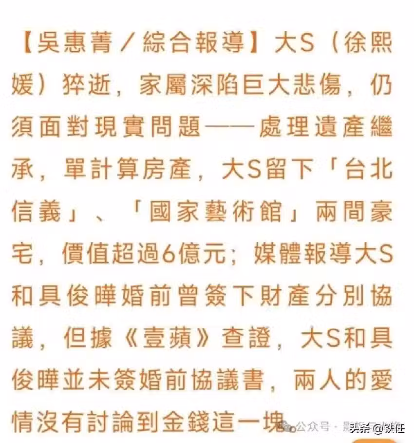 更令人震驚的是,調查出具俊曄和大S並未簽署婚前財產協議,這意味著他即便口頭放棄,法律上仍有可能繼承大S三分之一的財產。