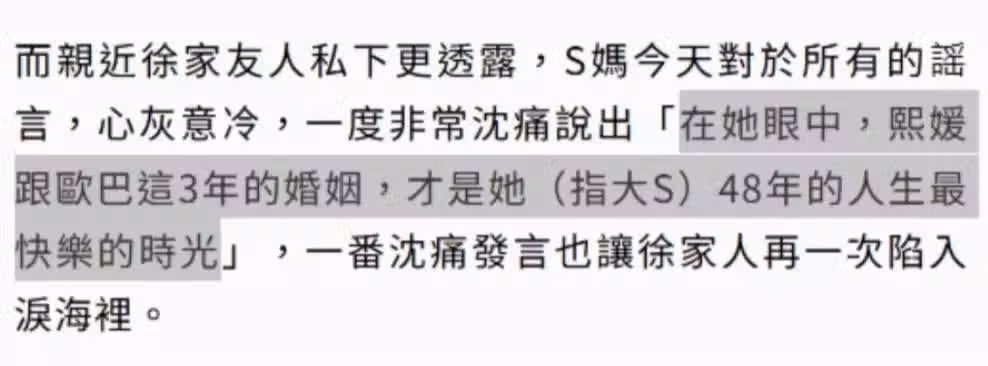 早在此前她就對媒體形容:「在她的眼中,熙媛跟歐巴具俊曄這3年婚姻,才是她人生48年之中最快樂的時光!」
