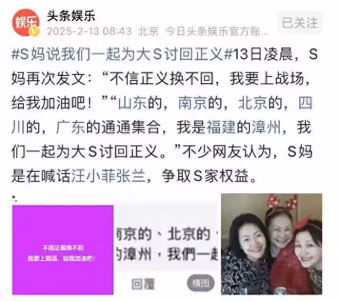 大S去世後,最不想看到的一面終究還是發生了,2月13日凌晨,S媽公開發文,她說:「不信正義換不回,我要上戰場,給我加油吧,山東的,南京的,北京的,四川的,廣東的統統集合,我是福建的漳州,我們一起為大S討回正義」,不少網友認為,S媽是在喊話汪小菲,爭取S家利益。