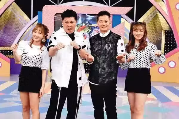 張文綺(右一)錄製《天才沖沖沖》經常在節目中製造不少「笑果」讓其他主持人徐凱希(左起)、曾國城、徐乃麟招架不住(華視提供)主辦單位擔心會影響倒數,所以要主持人加快前半場的演出節奏,結果壓軸演出的荒山亮表演結束,距離倒數竟還有半小時,見到荒山亮走下台,讓在後台的張文綺嚇一大跳,連忙抄起麥克風衝上台唱歌。