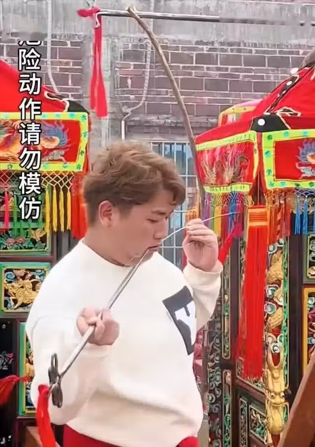 全紅嬋家裡擺宴席鬧元宵,照片懸掛在游神車,哥哥表演穿令箭習俗