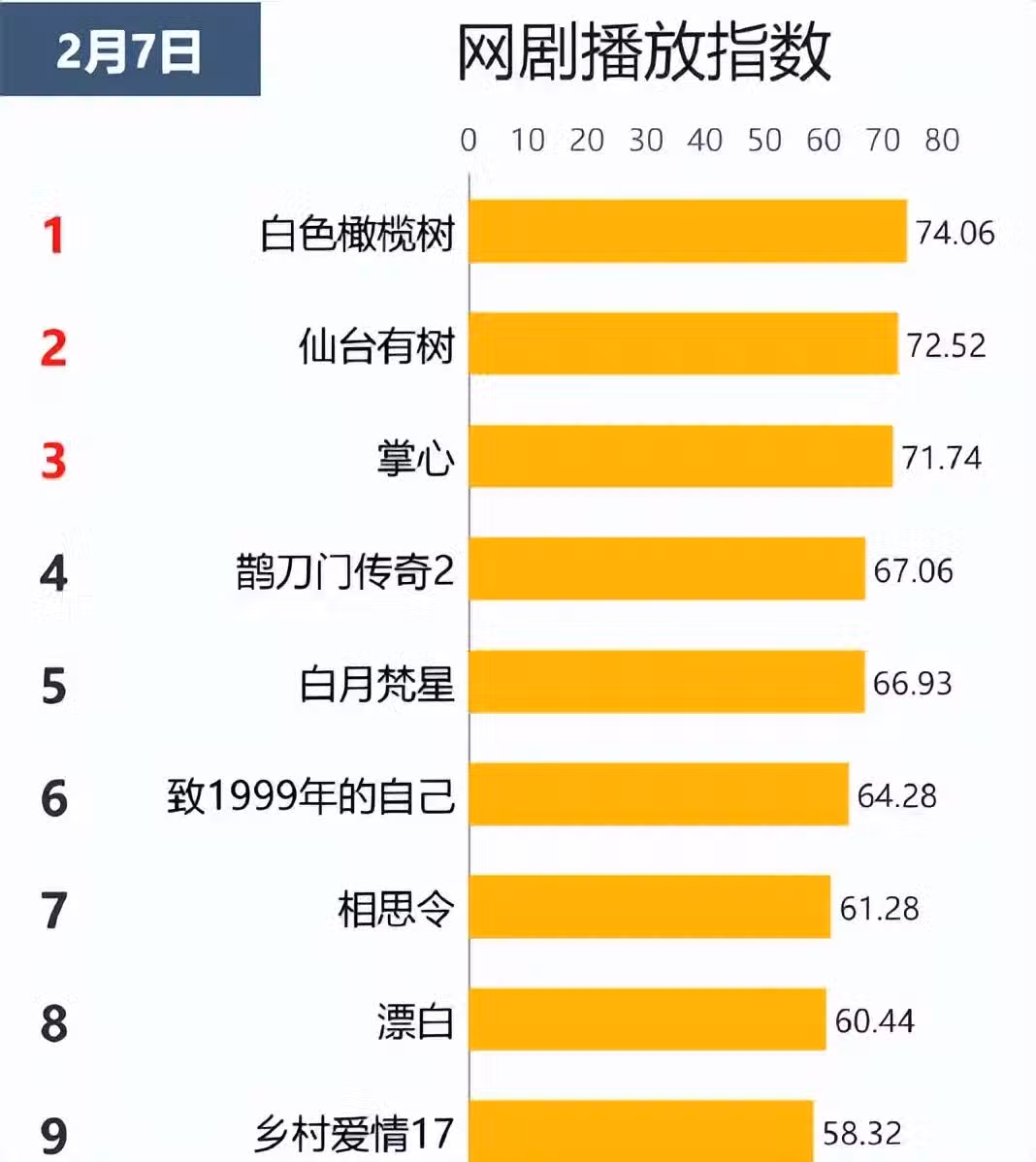 網劇播放指數:《白色橄欖樹》繼續登頂,《仙台有樹》位列第二!~~