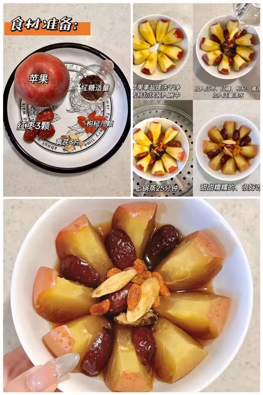 蒸熟的蘋果口感極為綿軟,其膳食纖維在蒸煮過程中得到軟化,大大降低了胃部的消化壓力,使得胃部更輕鬆地接納。品嘗時,甜蜜中略帶一絲微酸,滋味頗佳,讓我十分喜愛。食用後,胃部感覺溫暖舒適。同時,蒸出的蘋果汁也是美味可口,頗受好評。