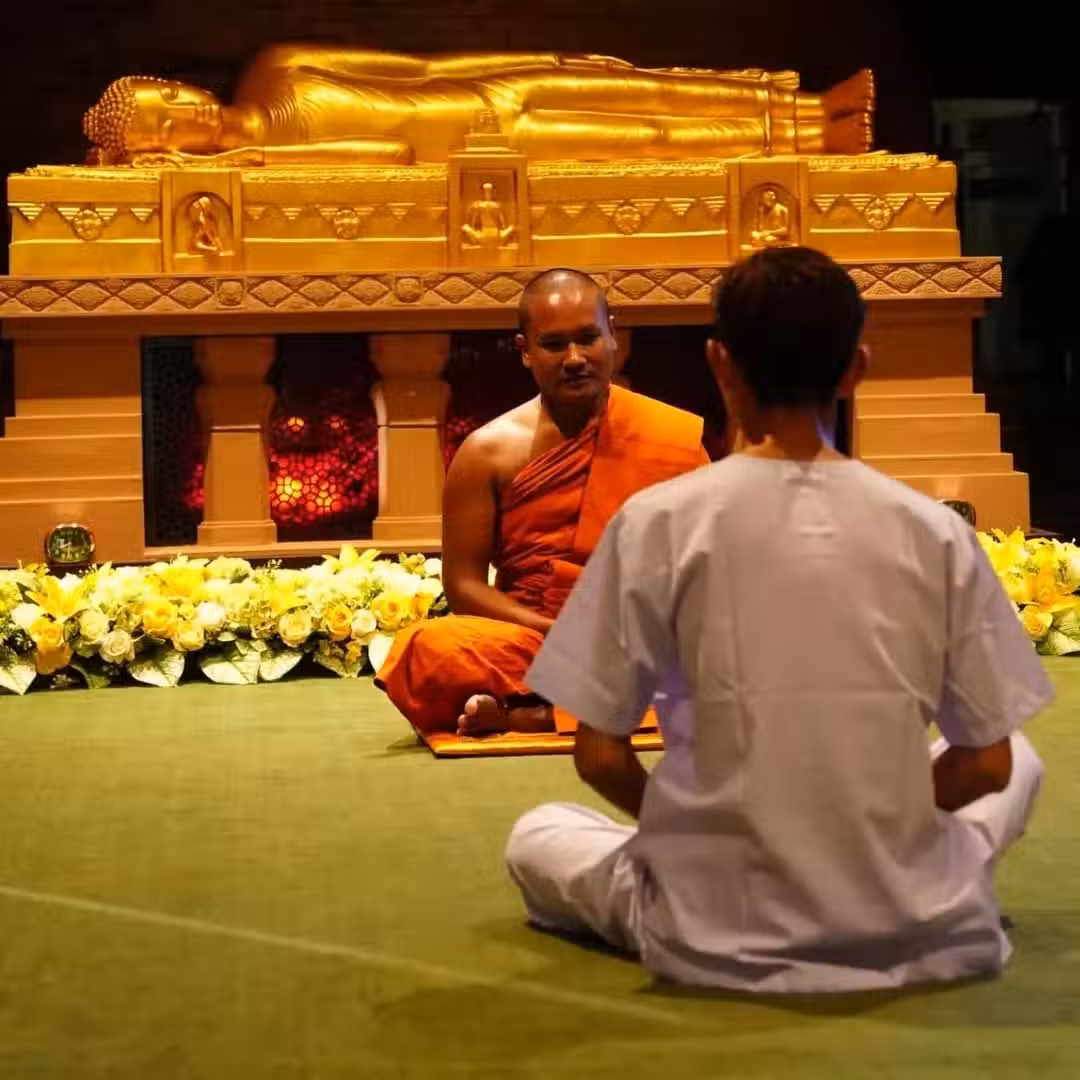 阿翔凌晨三點半被節目組從美夢中喚醒,直接帶往泰國寺廟Wat Cholpratarn Rangsarit體驗修行生活,在寺廟中,每個小時都有不同的法師帶領誦經,但他直言腦袋還沒清醒,也完全聽不懂經文內容,崩潰喊話:「身體被困在那邊,完全動彈不得......」一心挂念著後續的舞蹈表演拍攝,只能不斷看時間,想趕快恢復自由之身!