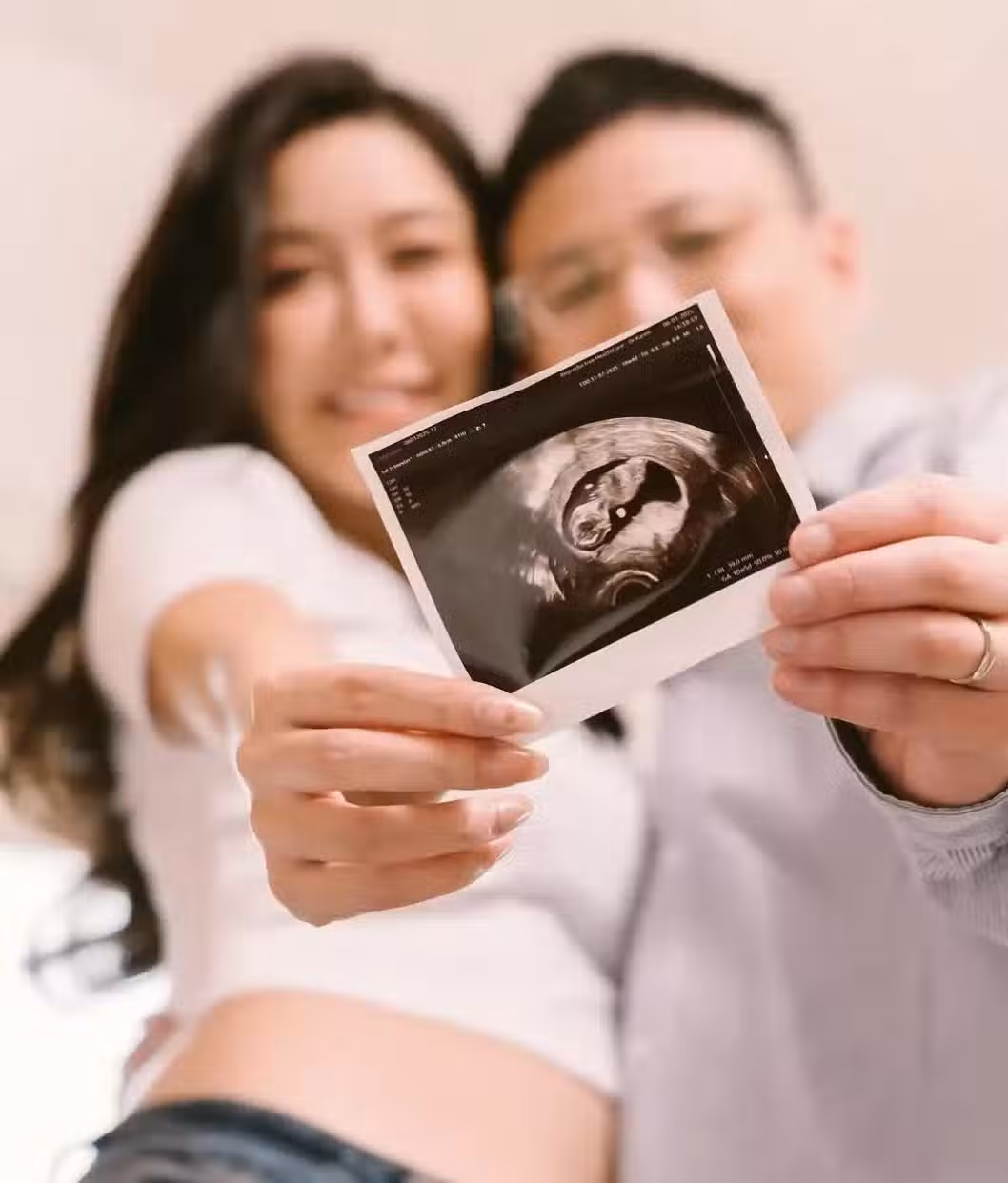 除此之外,兩夫妻還有不少正面照曝光,他們共同將彩超照舉在身前,面貼面的展露笑顏,陳詩欣還穿著超短上衣,露出她的孕肚。