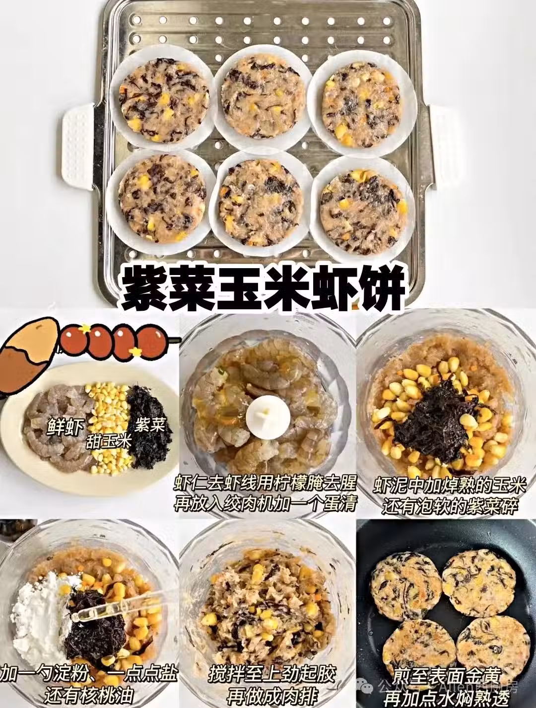 • 將蝦泥放入大碗中,加入甜玉米粒和切碎的紫菜。