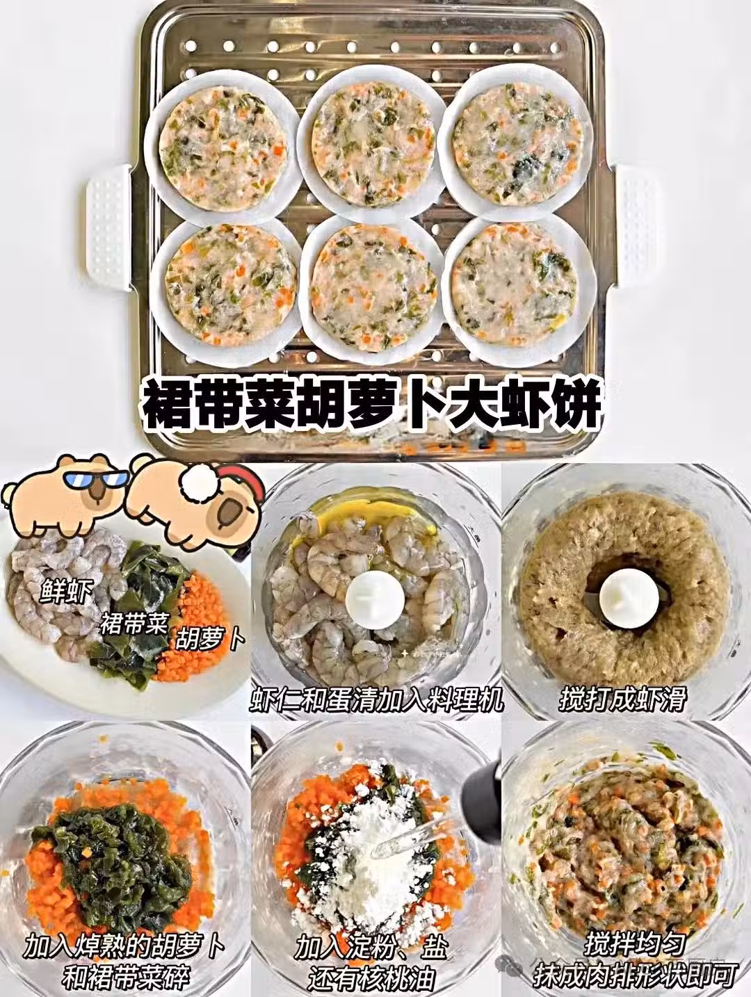 • 將蝦泥放入大碗中,加入裙帶菜碎和胡蘿蔔丁。