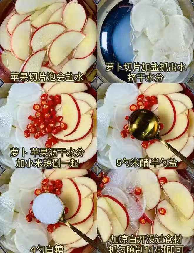 除了獨特的口感之外,這道菜還有很多健康益處。蘋果富含維生素C和膳食纖維,有助於促進消化和增強免疫力;白蘿蔔則具有清熱解毒、健脾開胃的作用;米醋不僅能增加食慾,還能幫助分解脂肪,減輕腸胃負擔。再加上一點小米辣的刺激,整道菜既能開胃又能助消化,實在是非常健康的美味小菜。