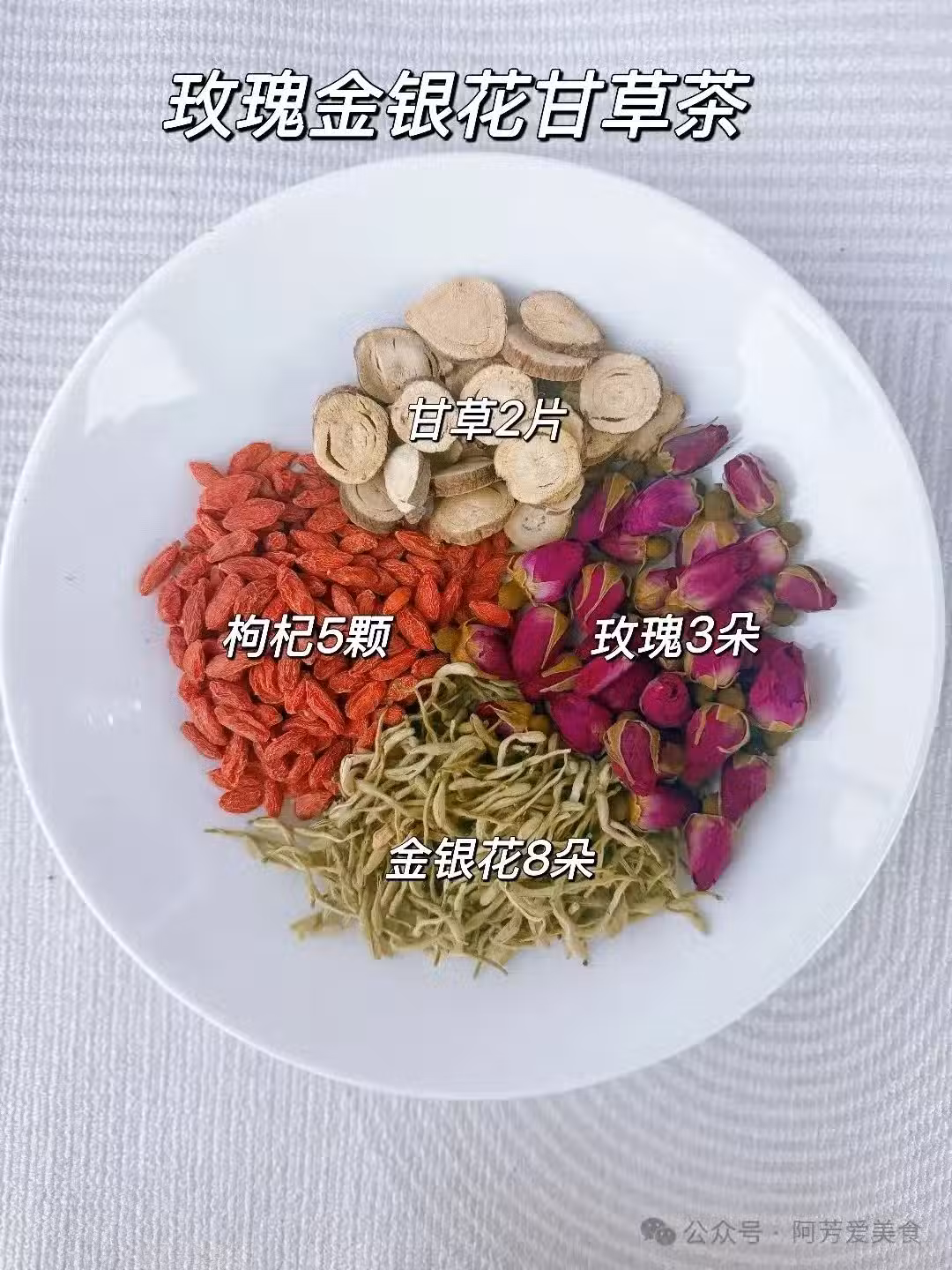 玫瑰搭配金銀花,再加入枸杞和甘草,準備的味道會非常的清爽,金花帶著一絲微苦再融合枸杞,喝起來就不怎麼感覺到苦的。