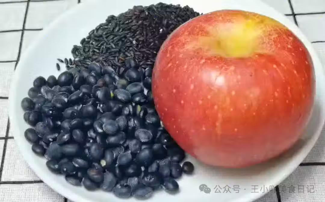 蘋果 1個、黑豆 100克、黑米 60克、蓮子 30克、花生米 10克、紅棗 一小把(約10顆)、炒熟的黑芝麻 1勺、清水 500克左右