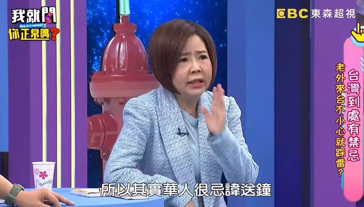 對於華人來說,送鍾十分不吉利,因為剛好有「送終」的諧音,所以拿鐘錶類當作禮物絕對是大忌!話鋒一轉,于美人也進一步說明,送鐘的不祥寓意其實可以被破解,除了給送禮者1塊錢當作是自己買下的,也可以將收到的鐘表放在廁所一個月,象徵「有始(屎)有終(鍾)」,隨後她也強調自己絕對不是胡說,希望大家也不要太過鐵齒。