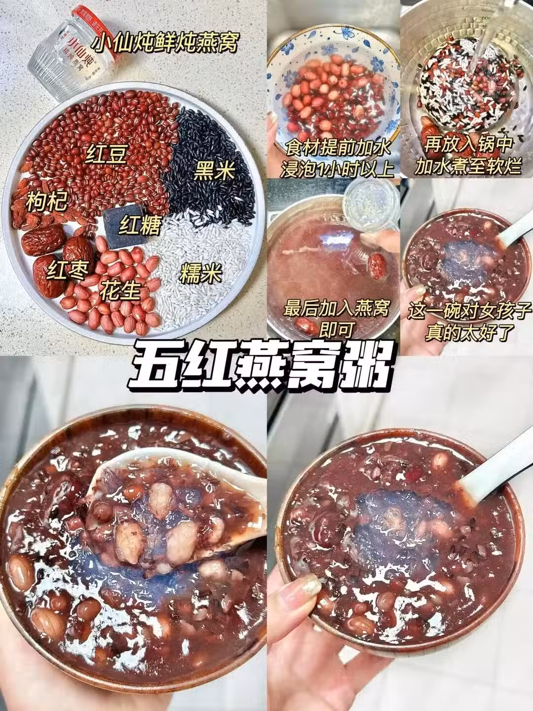 1.紅豆、黑米、糯米洗凈,提前浸泡一晚,紅棗切塊去核,花生用清水洗乾淨