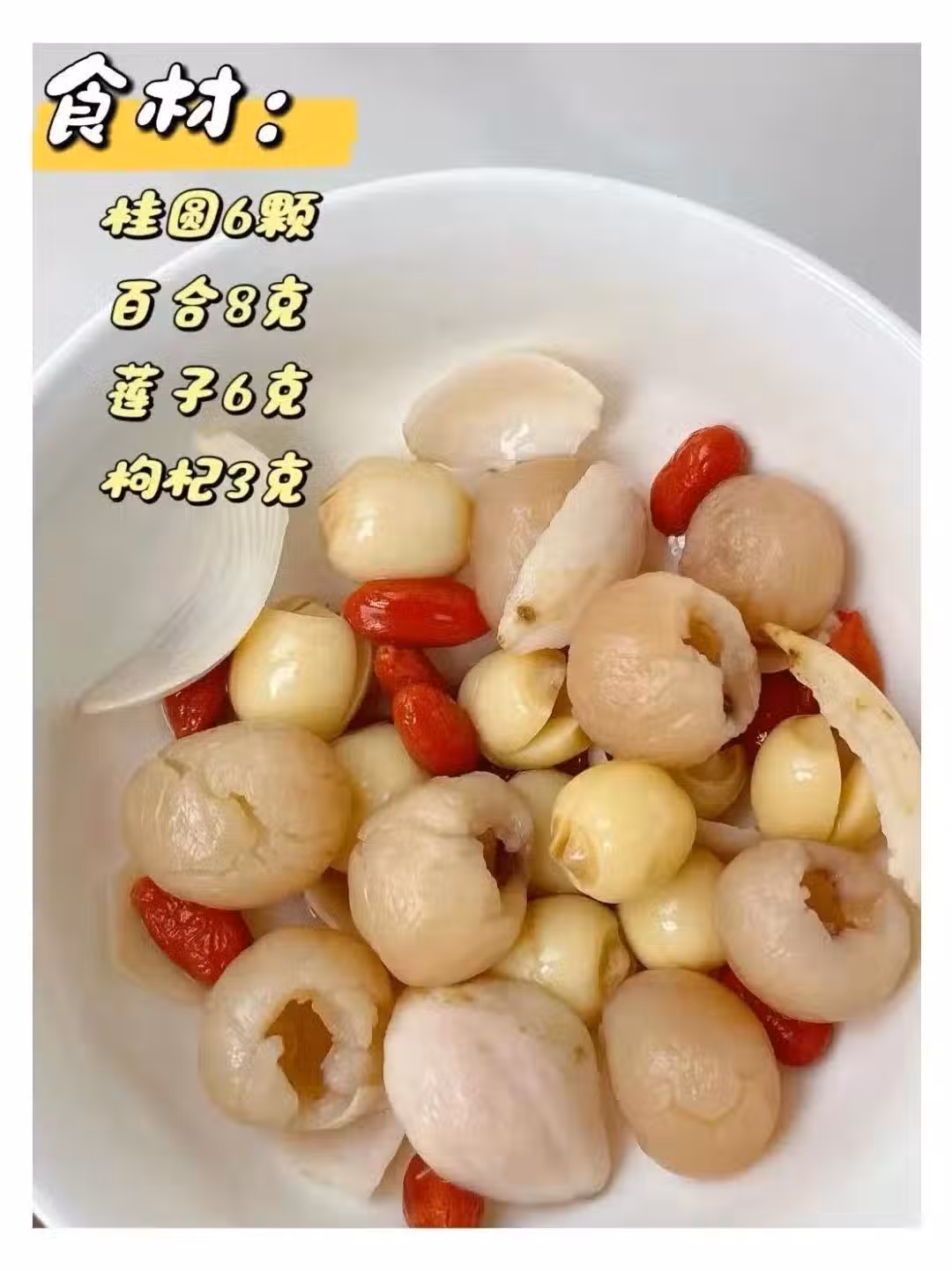 桂圓6顆十 百合10克蓮子15克 十枸杞3克